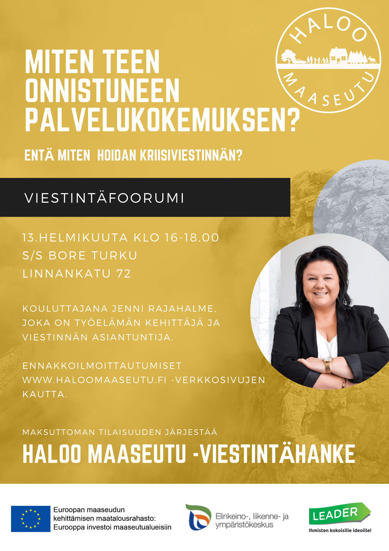 13. helmikuuta 2020 järjestetään maaseudun yrittäjille ja yhdistyksille suunnattu viestintäfoorumi, jossa pohditaan onnistunutta palvelukokemusta. Tilaisuudessa käydään läpi myös sitä, miten kriisin koittaessa kannattaa hoitaa yrityksen tai yhdistyksen viestintä.