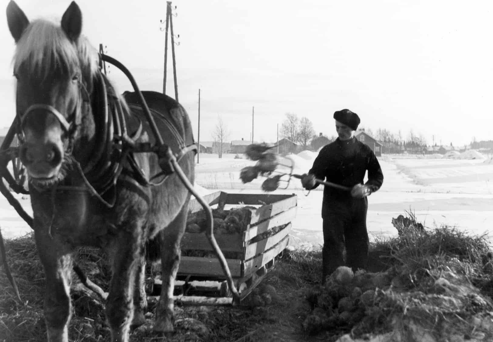 Kuvassa lastataan nauriita rekeen Ulvilassa talvella 1938. Kuva: Niilo Valonen, Ulvilan Kotiseutuyhdistys ry.