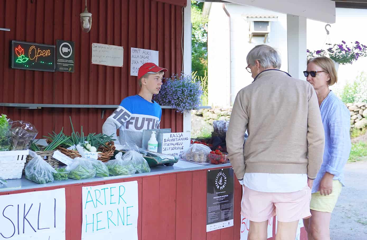 Närboden – Lähipuoti säljer bland annat säsongens grönsaker och mathantverksprodukter invid vägen till Åbo. Enligt Samuel Engblom som sommarjobbar är det framför allt jordgubbar och färskpotatis som går åt i juli.