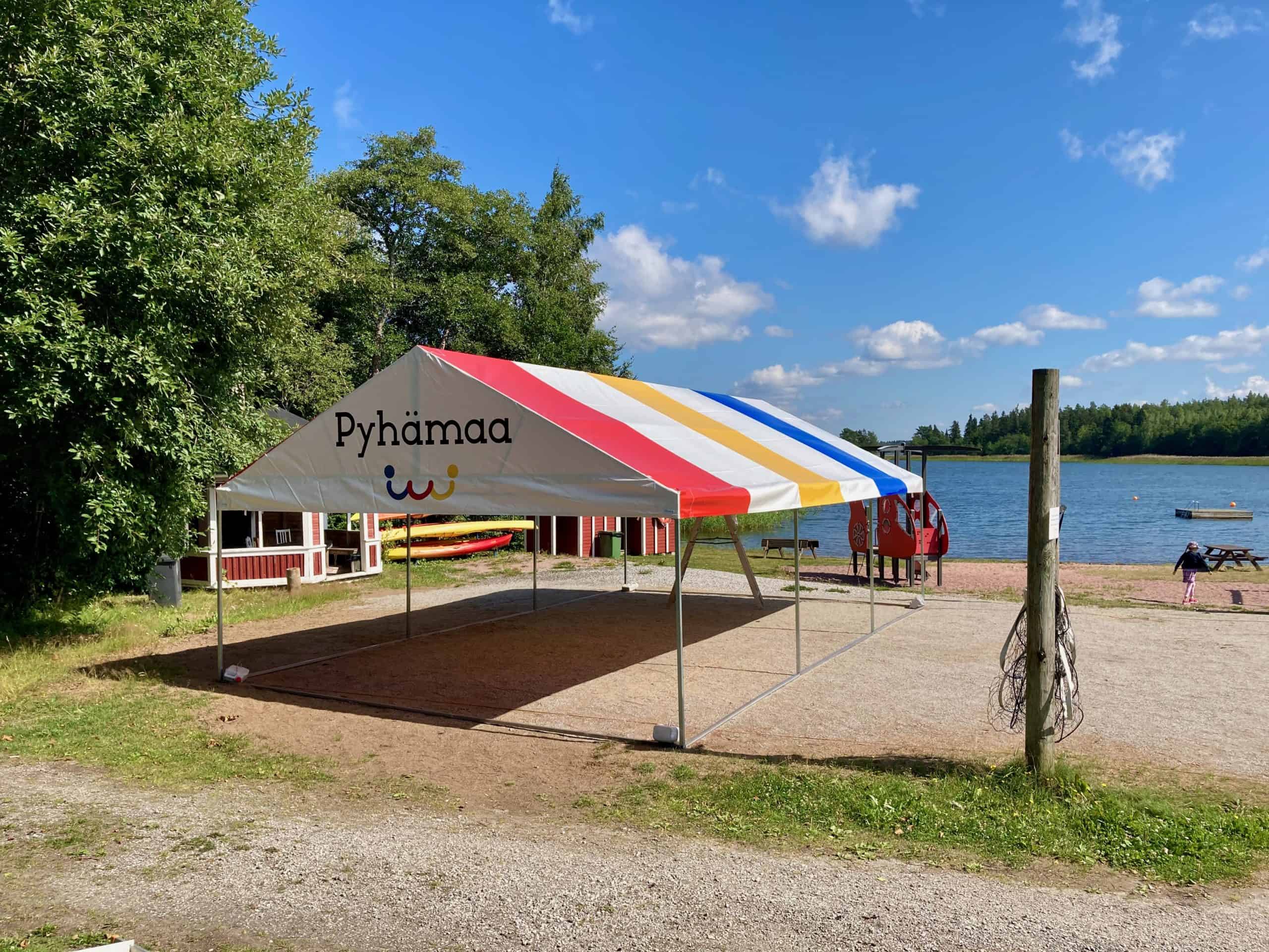 Pyhämaan uutta logolla ja brändin väreillä varusteltua juhlatelttaa saavat hyödyntää kaikki kylän toimijat. Kuva: Kari Aalto.