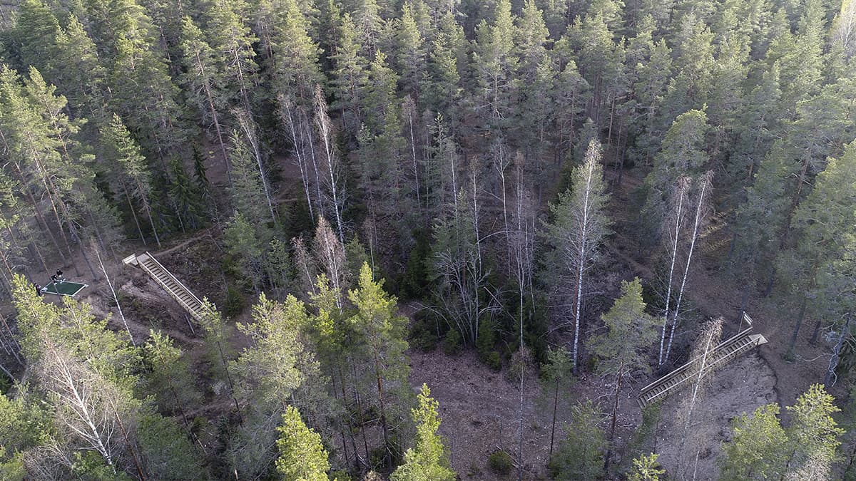 Ilmakuvassa kahdet kuntoportaat metsän siimeksessä.