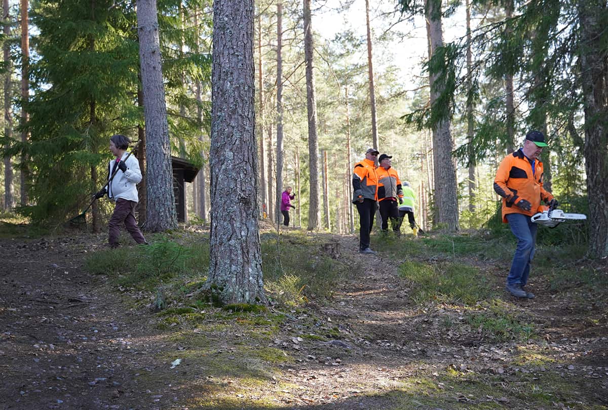 Ihmisiä metsässä haravoimassa ja karsimassa kasvustoa.