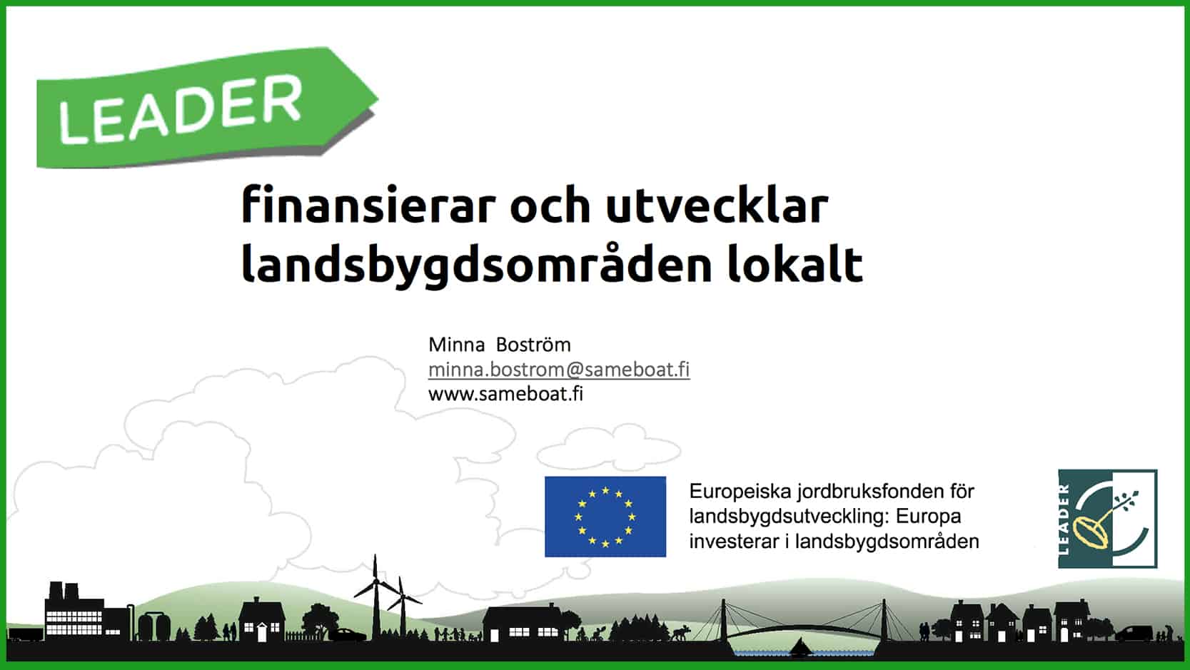 00:00:00 Webbinariet öppnas, Leaderverksamheten presenteras: Minna Boström, Leader I samma båt – Samassa veneessä