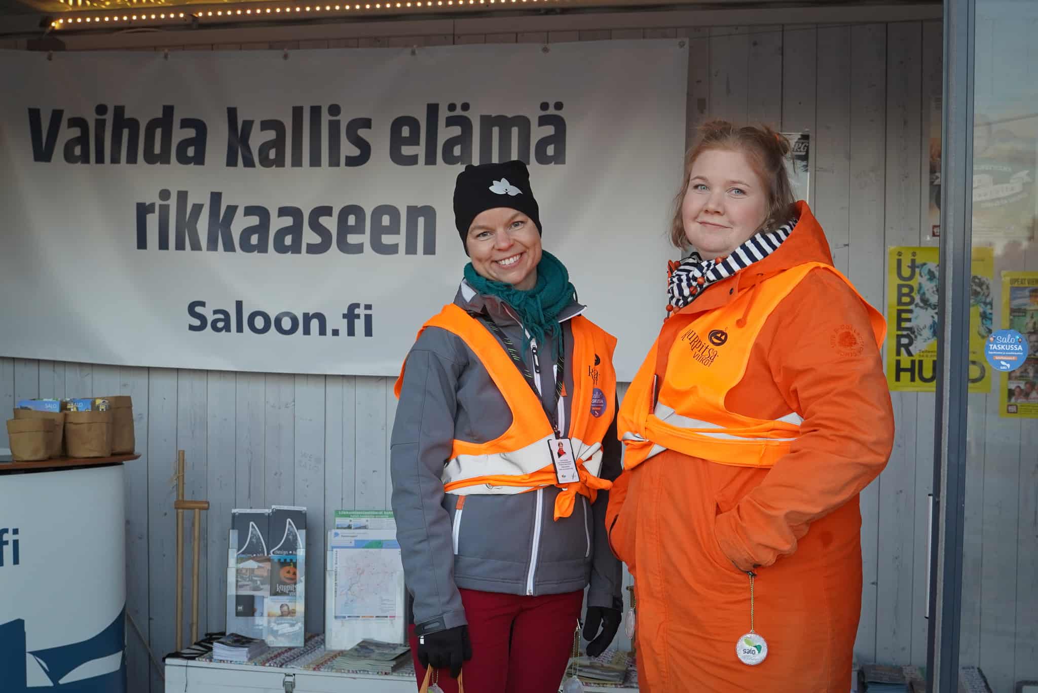 Länsi-Suomen Maa- ja kotitalousnaisten ruoka-asiantuntijat Henna Kyyrä ja Janita Kylänpää Salon kaupungin infopisteellä.