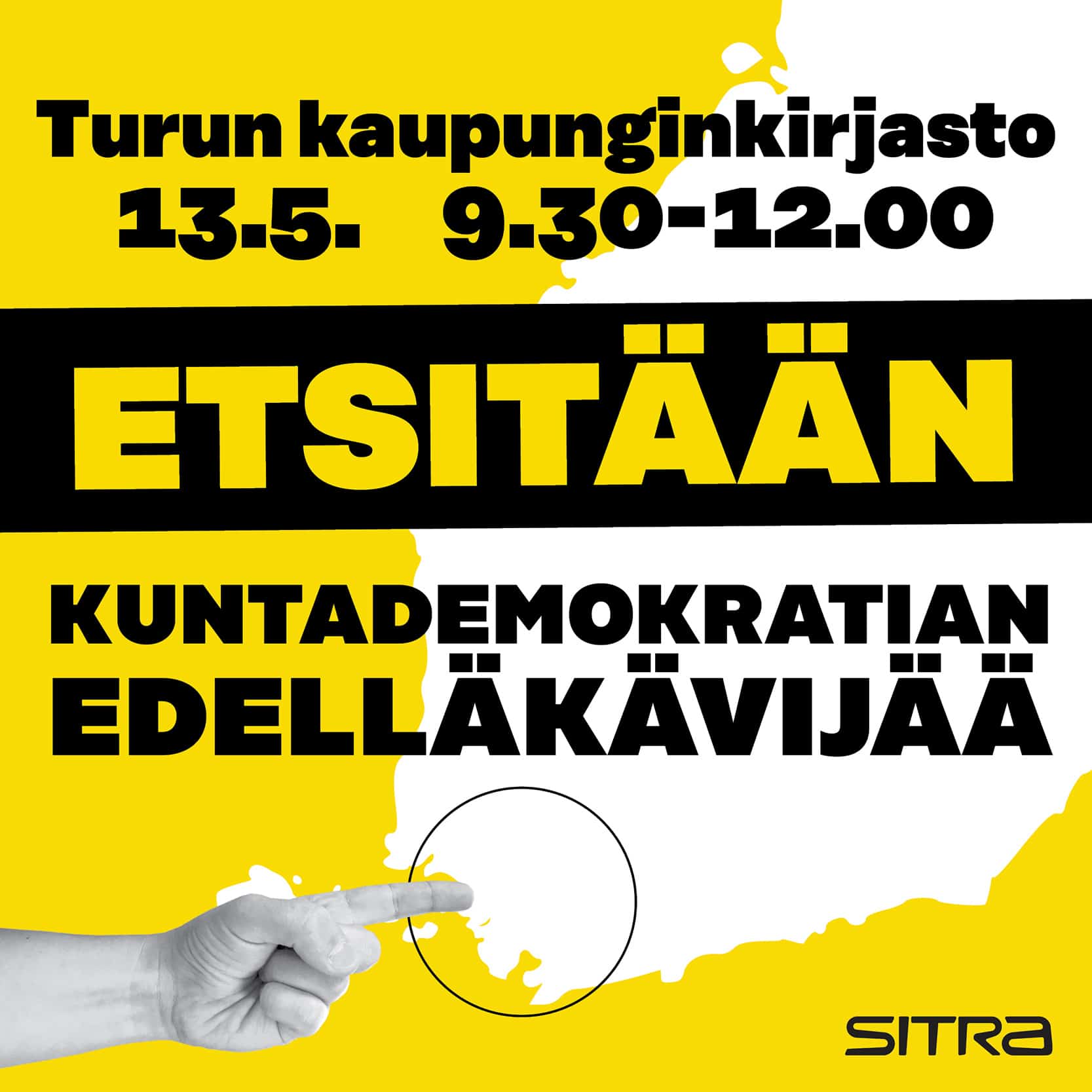 Sitra kutsuu Varsinais-Suomen luottamushenkilöitä, kunnissa kehitystyötä tekeviä viranhaltijoita, järjestötoimijoita, tutkijoita, kansalaisaktiiveja ja teknologian sekä alustojen kehittäjiä yhteen uudistamaan paikallista vaikuttamista. Tavoitteena on kerätä yhteen kentän vaikuttajat Suomessa ja rakentaa areena demokratian uudistamistyölle. Kunnallisen osallistumisen uudet keinot -työpajoissa luodaan jaettua ymmärrystä osallistumisen haasteista ja kehityskohteista ja pohditaan mihin tarttua seuraavaksi.