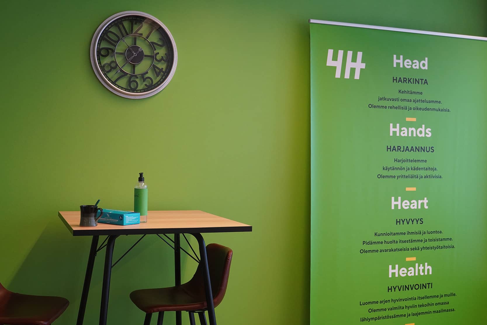 Vihreä seinä, jonka edessä 4H:n roll-up-mainos.