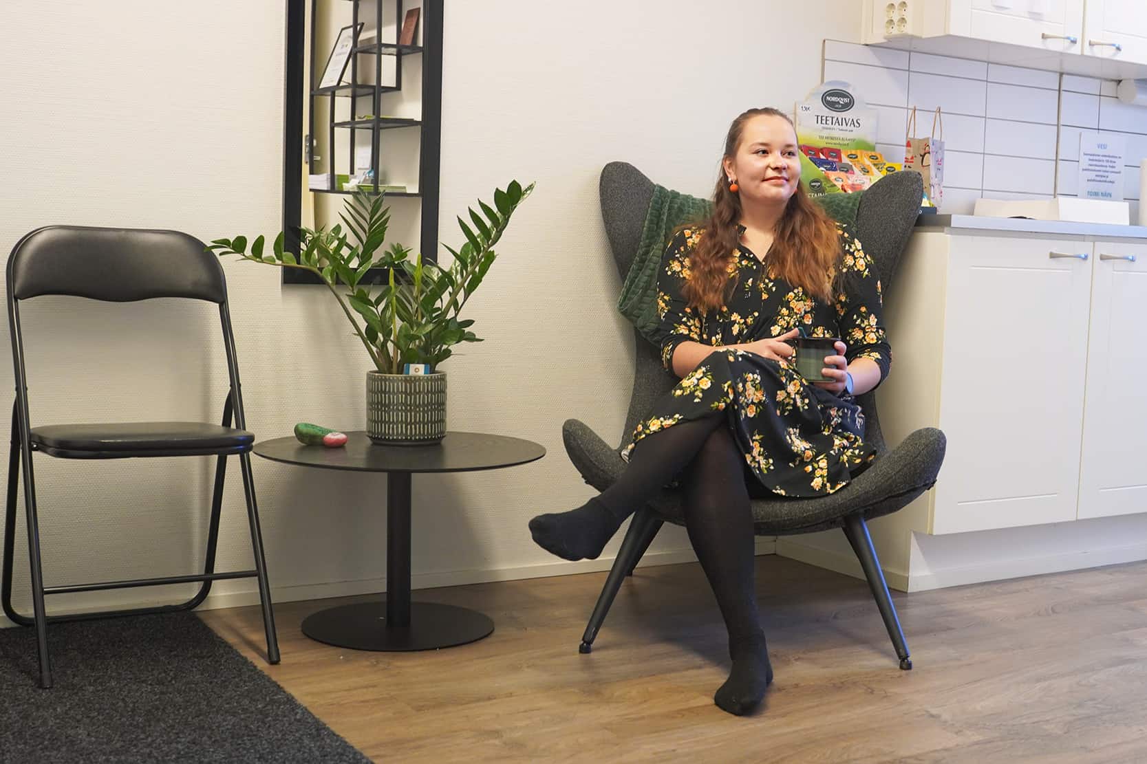 Nainen istuu nojatuolissa.