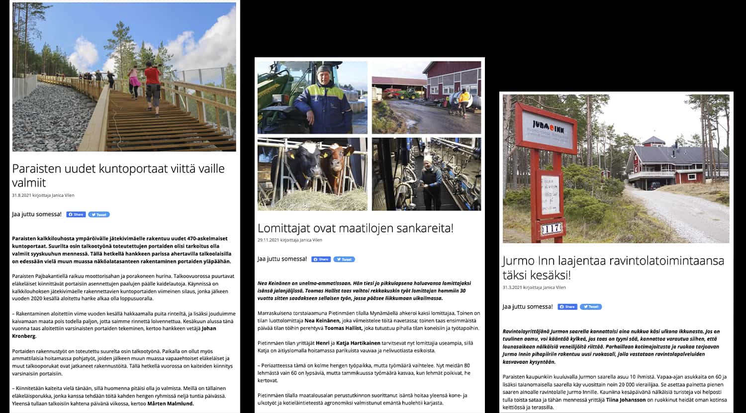 Haloo maaseudussa on vuonna 2021 julkaistu 169 artikkelia, joista kolme suosituinta antaa kattavan kuvan maaseudun kehittämisestä. Vuonna 2021 julkaistuista uutisista luetuin oli juttu Paraisten uusista kuntoportaista. Toiseksi eniten luettiin juttua lomittajista maatilojen sankareina. Kolmanneksi suosituin uutinen oli Jurmo Inn -ravintolan laajennus.