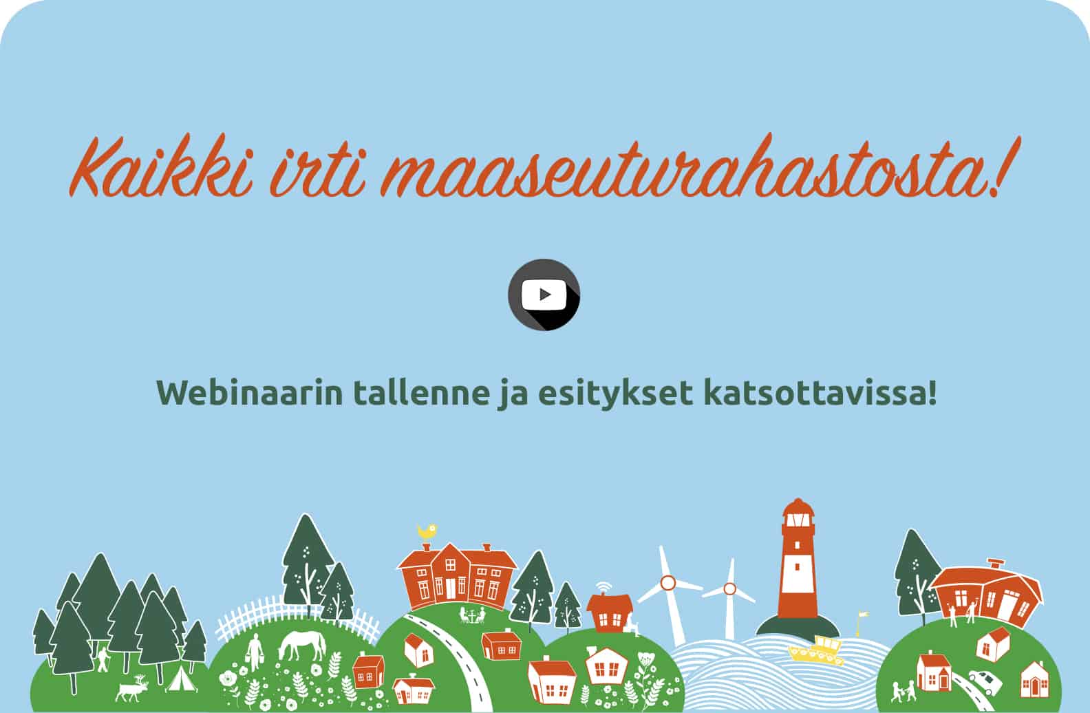 Varsinais-Suomen maaseutuverkosto perehdytti maakunnan poliittisia päättäjiä ja muita vaikuttajia maaseudun kehittämismahdollisuuksiin keskiviikkona 9. helmikuuta klo 18–20 pidetyssä webinaarissa. Tallenne on nyt kaikkien vapaasti katsottavissa, eli tervetuloa tutustumaanmaaseudun monipuolisiin kehittämismahdollisuuksiin!