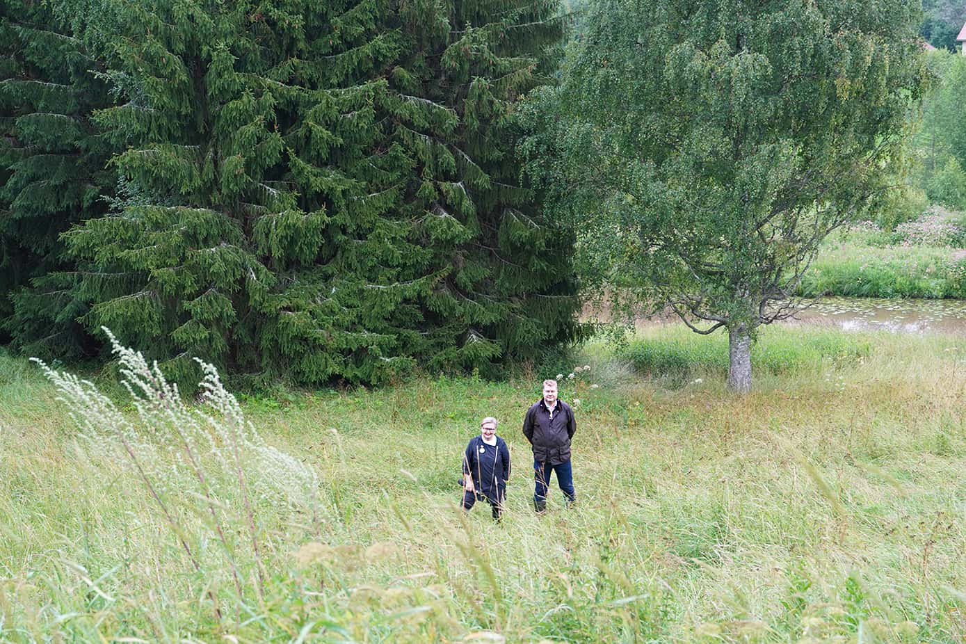 Kaksi henkilöä seisoo heinikkoisessa maisemassa.