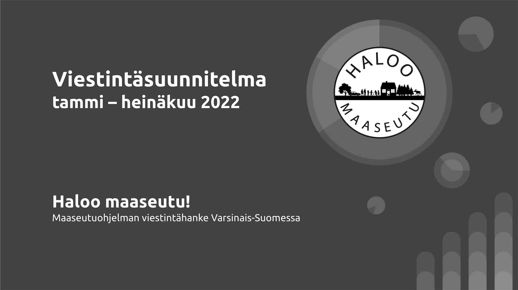 • Inspiraatiota oman viestintäsuunnitelman tekemiseen voi hakea lukemalla Haloo maaseudun suunnitelman: