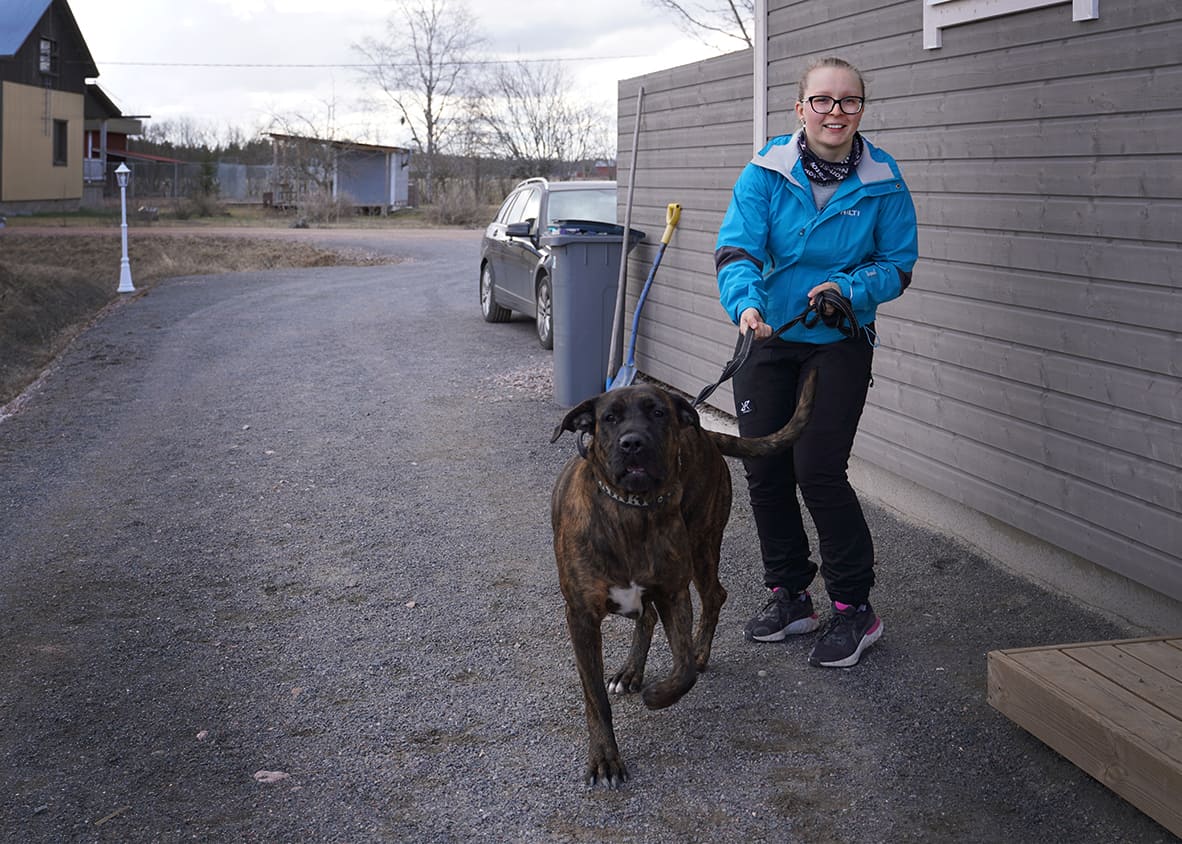 Jenni Virtanen ulkoiluttamassa vakiasiakastaan Pinkkiä, jossa on kanariandoggia ja cane corsoa.