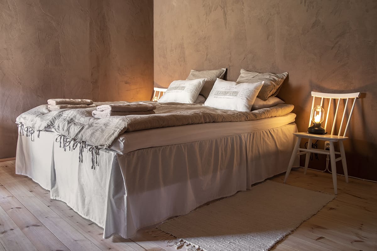 Kahvilassa ja majoitushuoneessa on savirapatut seinät. Savi on hengittävä materiaali, joka kerää ja päästää kosteutta sään mukaan ja tarjoaa siten sisäilman, jota on aina hyvä hengittää. Elävä pinta on tunnelmallinen ja sävyä saa vaihdettua värjäämällä. Kuva: Ulla Jokela.