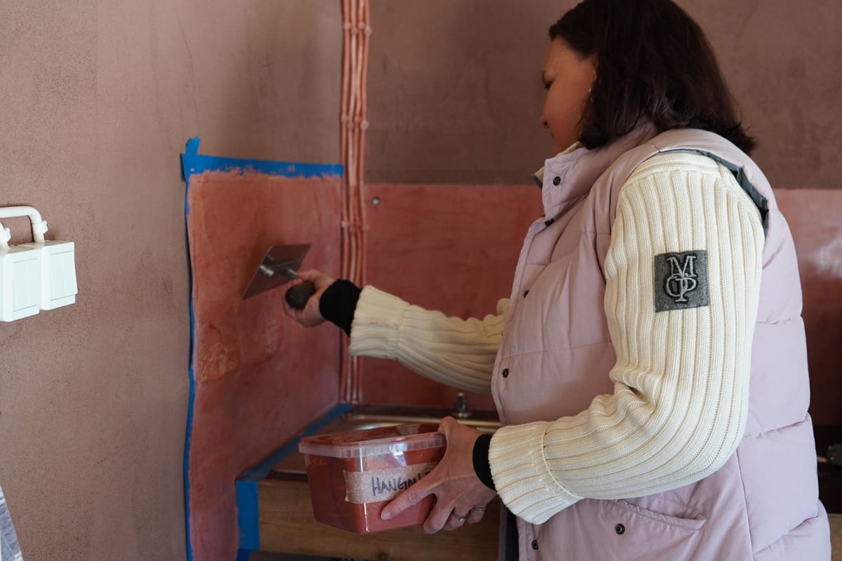 Kahvilan työtasojen kohdalla oleva stucco on päällystetty mehiläisvahalla, joka tekee seinästä vettä hylkivän.