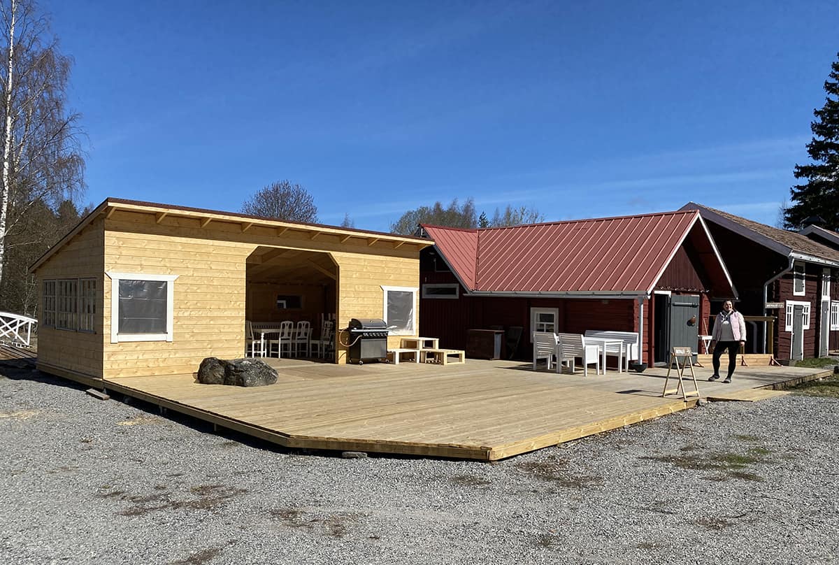 Vasemmalla uusi aitta ja terassi, oikealla vanhoja punamultamaalissa olevia rakennuksia.