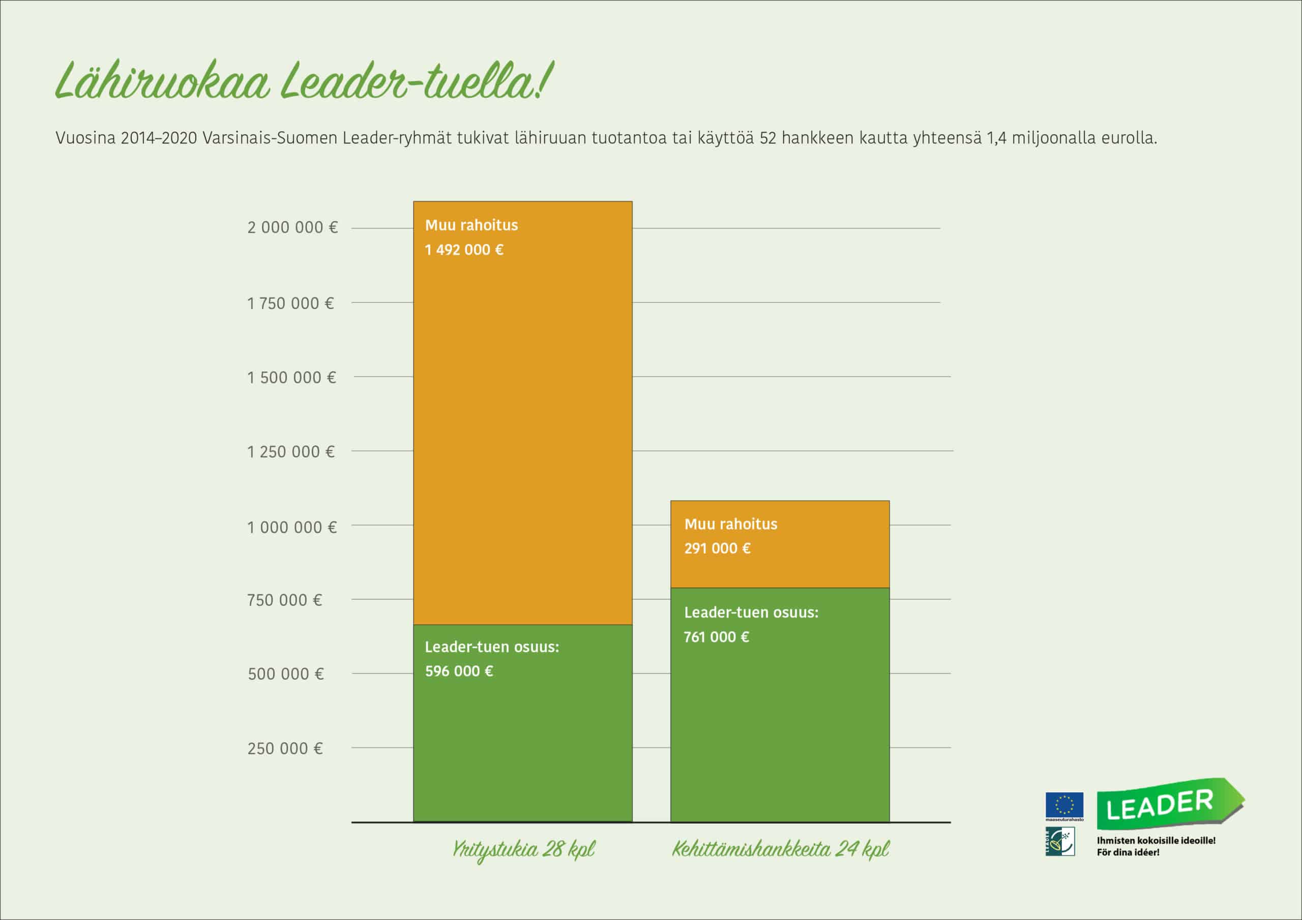 Vuosina 2014–2020 Varsinais-Suomen Leader-ryhmät ovat myöntäneet 1,4 miljoonaa euroa tukea lähiruokaa edistäviin yleishyödyllisiin kehittämishankkeisiin tai yrityksiin. Yritystukia ryhmät ovat myöntäneet yhteensä 28 yritykselle 596 000 euroa. Tukivaroin on autettu markkinoille muun muassa paikallisia juustoja, pastoja, oluita ja viljatuotteita. Kehittämishankkeita on tuettu 24 kappaletta 761 000 eurolla. Kehittämishankkeilla on tuettu muun muassa ruokamatkailua, ruokatapahtumien järjestämistä ja lisätty kuluttajien tietoisuutta lähiruokatuotteista ja -perinteistä.