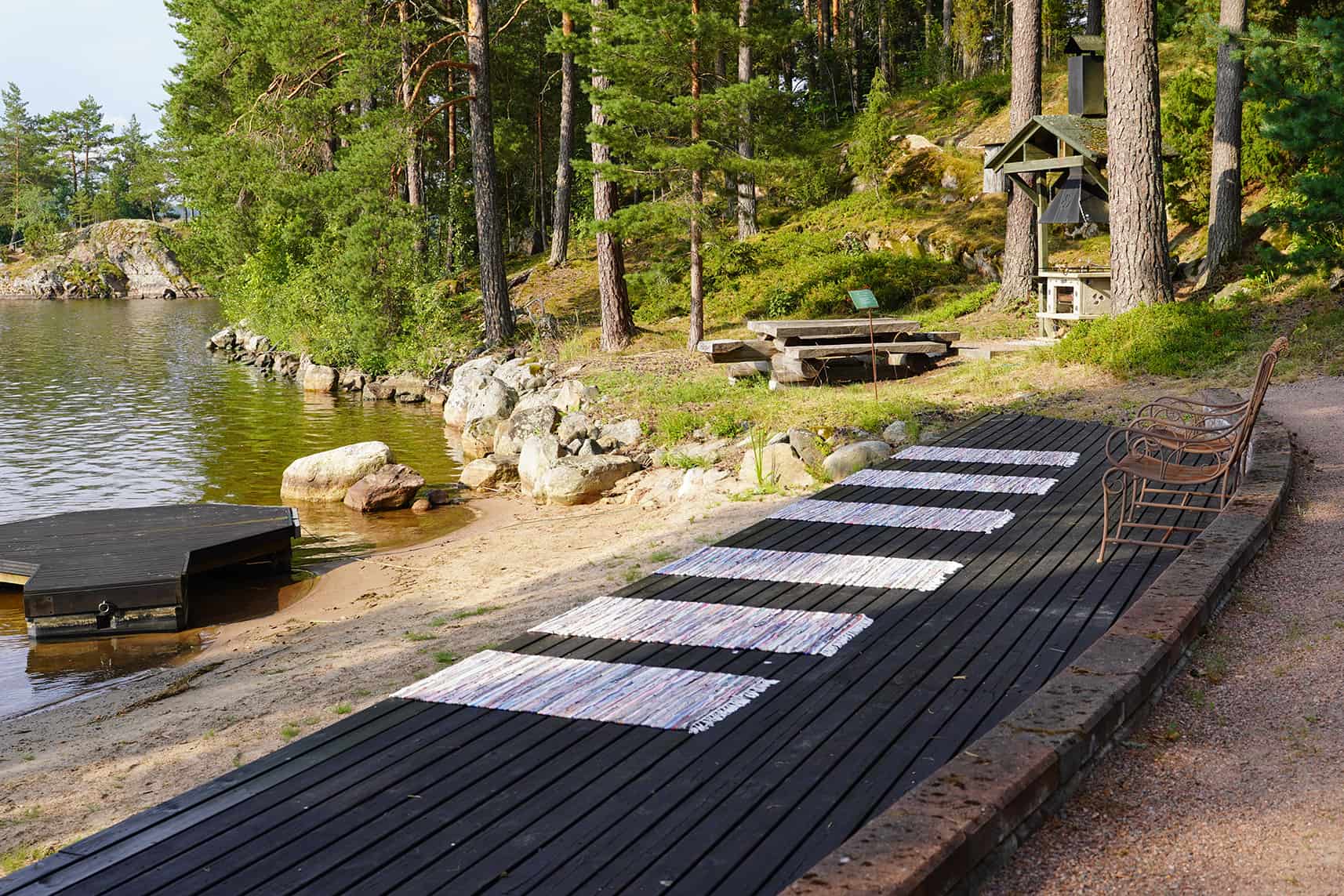 Rantaterassilla ollaan saman kokemuksen äärellä. Terassin tuoleille tai räsymatoille voi asettua istumaan tai makoilemaan: nauttimaan Etelä-Suomen suurimman järven maisemista ja samaan aikaan ympärillä olevan japanilaisen puutarhan kauneudesta.