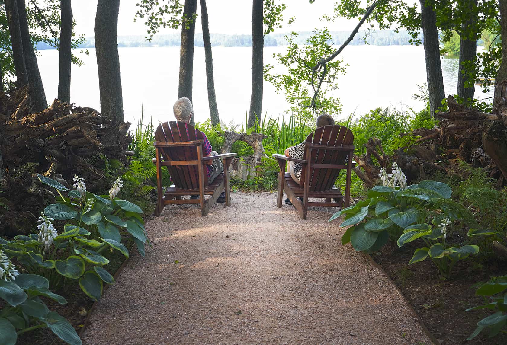 Myös pariskunta itse hakeutuu usein kantopuutarhan tuoleille miettimään. Kun antaa katseen levähtää kohti Lohjanjärveä, voi nauttia samaan aikaan avoimesta maisemasta ja metsäisen kantopuutarhan suojasta. Paikka, jossa yhdistyy avoin maisema ja suoja, on useimmille ihmisille sellainen, jossa pystyy parhaiten rentoutumaan ja löytämään olennaisen.