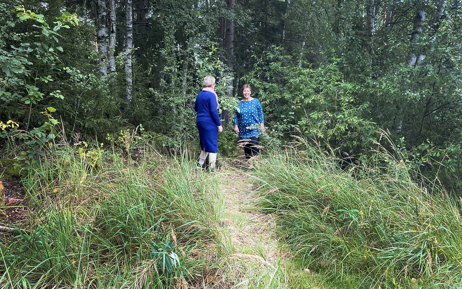 Leppijärveltä lähtee kylää kohti jo pieni polku, jota ei kuitenkaan pitkälle riitä. Kuvassa vasemmalla Tarja Kiviniemi ja oikealla Liisa Mäkelä.