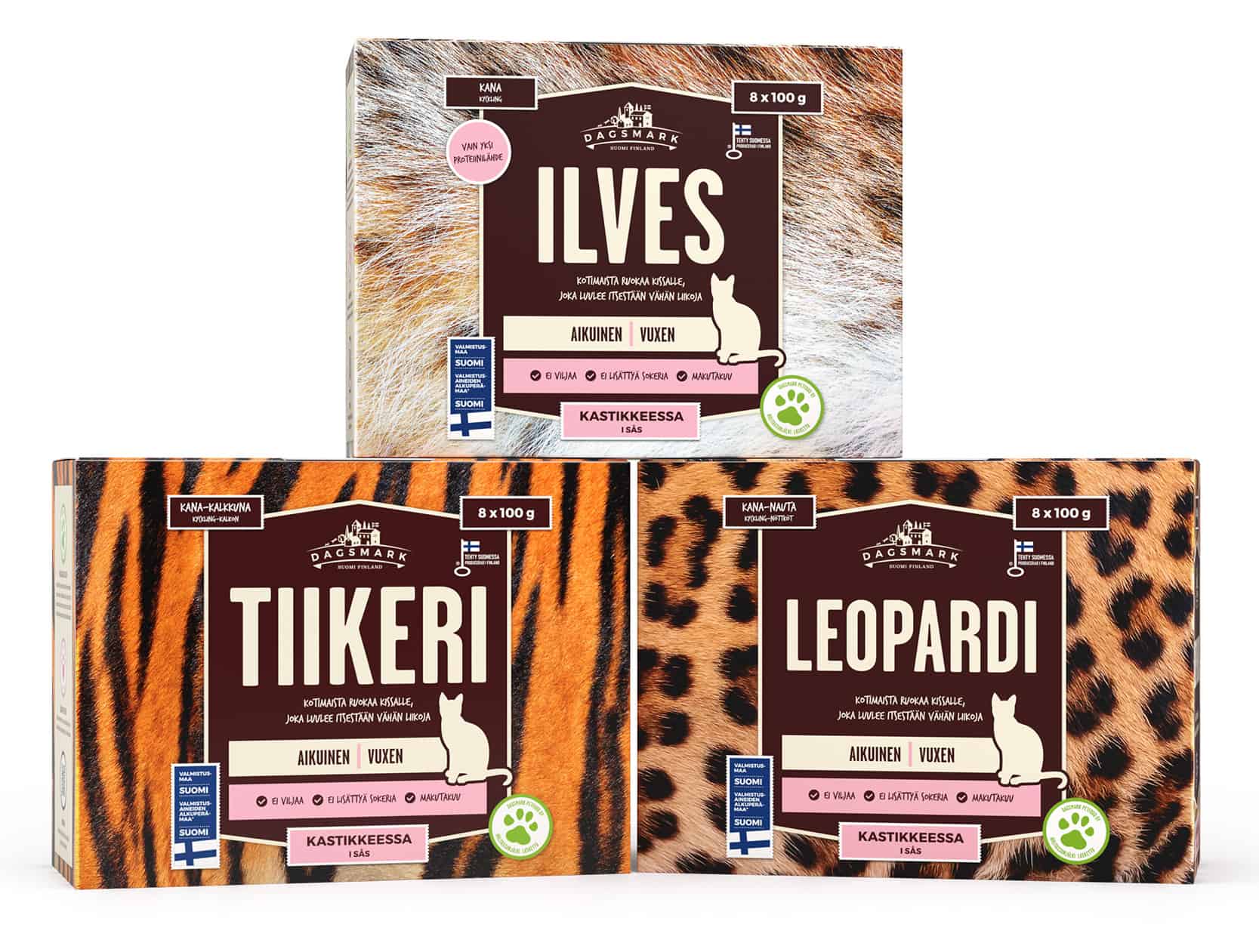 Dagsmark Petfoodin uudet kissanruuat ovat nimeltään Ilves, Tiikeri ja Leopardi. Kuva: Dagsmark Petfood.