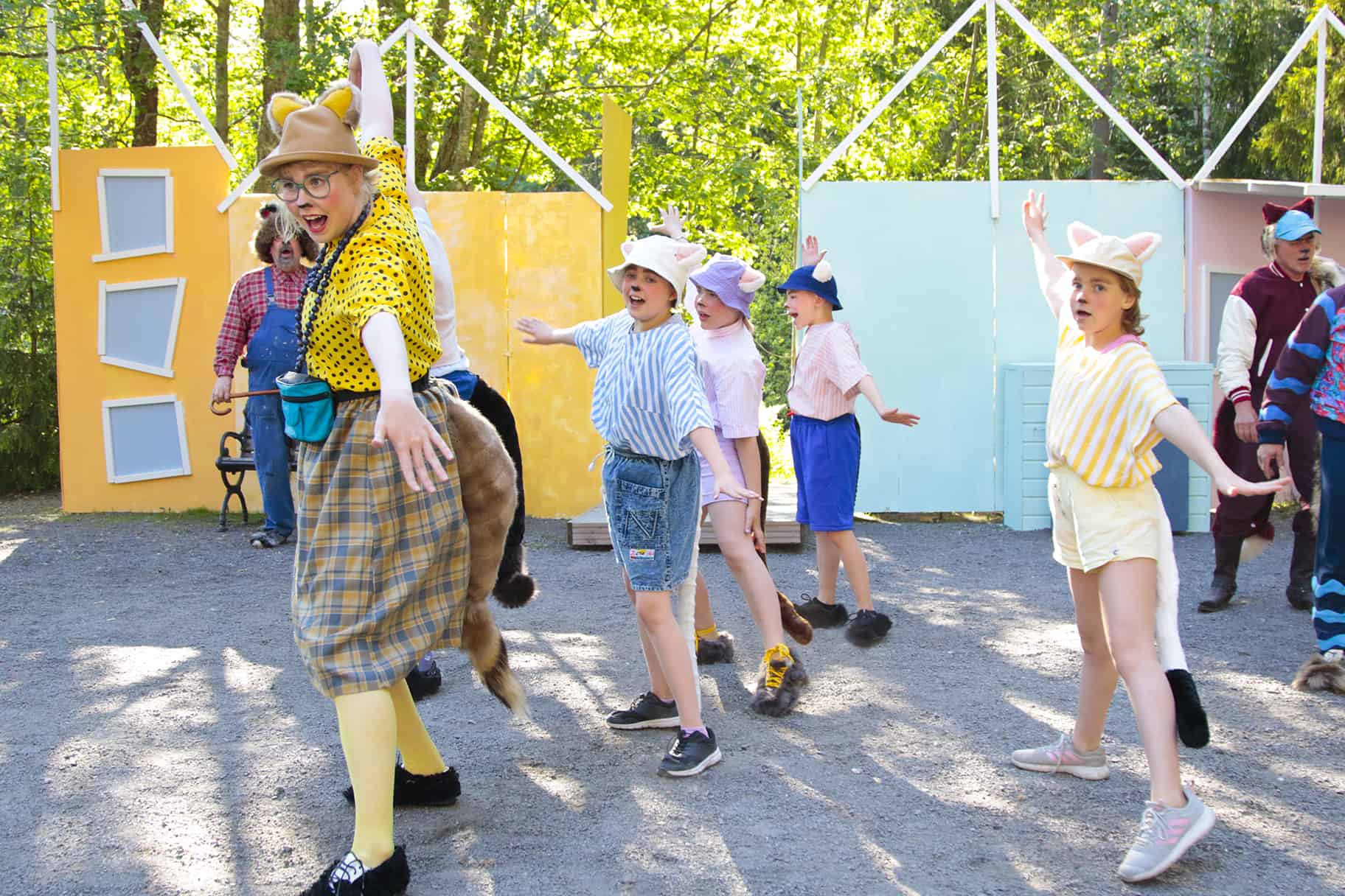 Kirakan kesäteatteri Salon Perniössä on muuttunut Suomen Tukholmaksi, jonka pastellisävyisten talojen kellareissa sekä kaduilla ja satamissa on kissamainen meno! Lavastuksella aikaan saatua satumaista miljöötä kruunaa näyttämön takana oleva lampi, jota hyödynnetään kekseliäästi tämän kesän kappaleessa: Pekka Töpöhännässä.