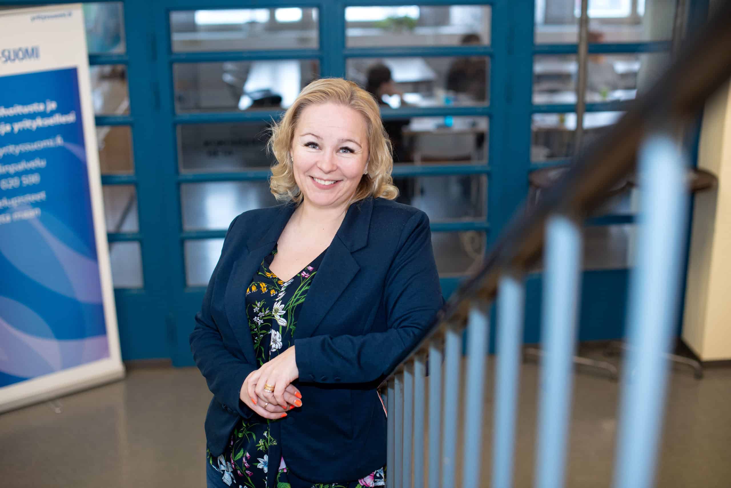 Heidi Loukiainen nojaa porraskaiteeseen toimistoympäristössä.