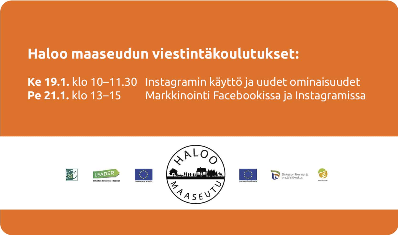Haloo maaseutu -viestintähanke järjestää tammikuussa kaksi verkkokoulutusta. Keskiviikkona 19. tammikuuta perehdytään Instagramin käyttöön ja uusiin ominaisuuksiin. Perjantaina 21. tammikuuta harjoitellaan markkinointia Facebookissa ja Instagramissa. Koulutukset on räätälöity palvelemaan Varsinais-Suomen maaseutuverkostoa, mutta mukaan saavat tulla kaikki aiheista kiinnostuneet.