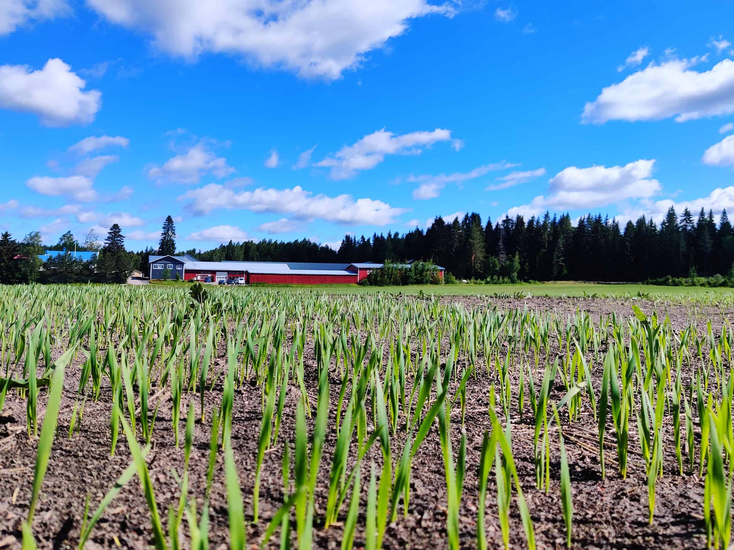 Orastava pelto etualalla ja punainen rakennus taka-alalla.